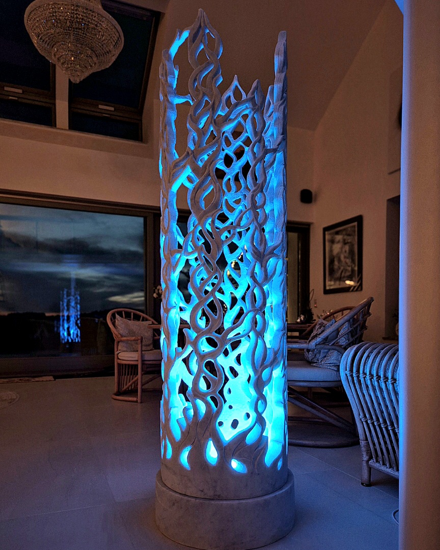 Im Inneren verbirgt sich eine integrierte Beleuchtung, die den Naturstein sanft von innen heraus zum Leuchten bringt. Das Licht durchdringt die filigranen Strukturen und erzeugt ein faszinierendes Spiel aus Transparenz, Tiefe und Schatten. Die organisch fließenden Formen erinnern an Bewegung, Wasser oder wachsende Strukturen und verleihen dem Objekt eine lebendige Dynamik.