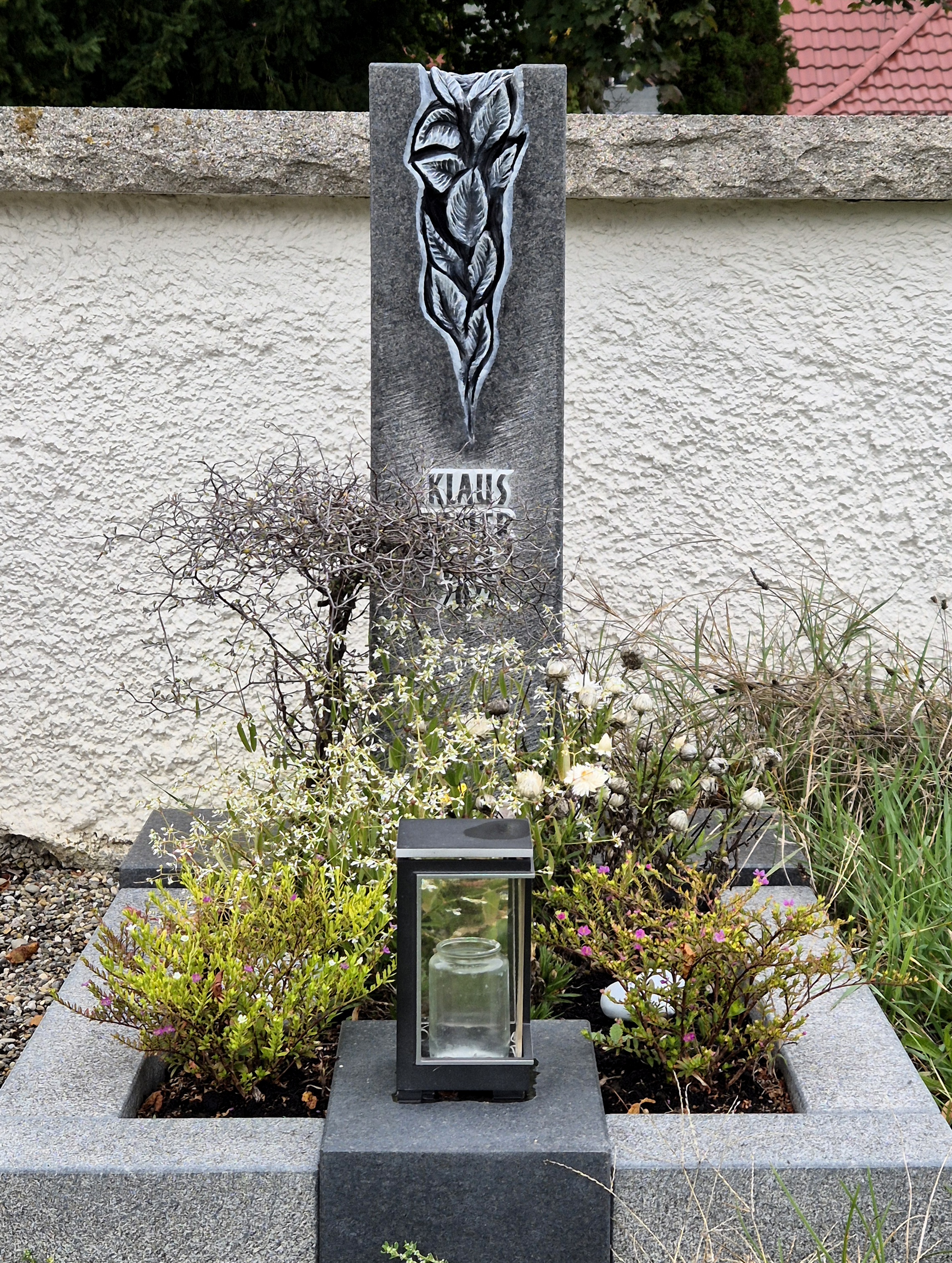 Die harmonische Verbindung von reliefierter Gestaltung und klarer Formensprache macht diesen Urnengrabstein zu einem würdevollen Ort der Erinnerung